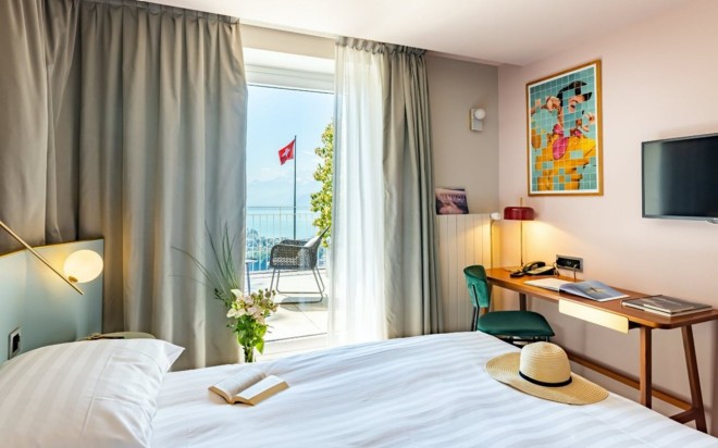 Geniessen Sie den privilegierten Blick von Ihrem privaten Balkon auf den Genfersee und die Alpen. Ein großzügiges, lichtdurchflutetes Zimmer – ideal für romantische und erholsame Aufenthalte.Ausstattung